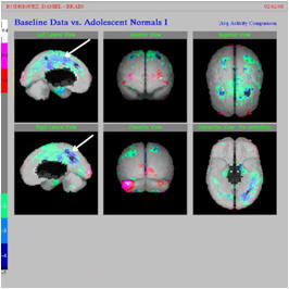 Imagen de un Brain SPECT scan demuestra la disminución de la función en los lóbulos temporales y frontales causada por la activación microglial.